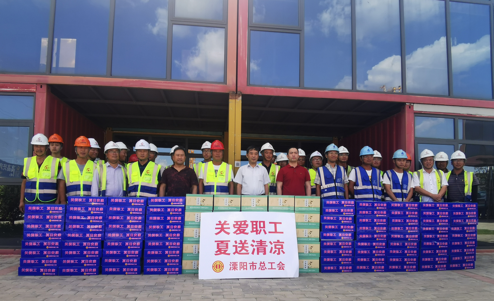 7月23日下午,正值盛夏時節(jié),酷暑當頭,驕陽似火,溧陽市總工會萬如才主任、秦益明部長等一行數(shù)人,走訪慰問了我司創(chuàng)優(yōu)立功重點項目—南航二期三標段項目部,開展“夏送清涼、關(guān)愛民工”慰問活動,向奮斗在高溫一線的建筑工人送上總工會的關(guān)愛,并送上一百多箱水果和礦泉水。集團總裁周瑜陪同接待。