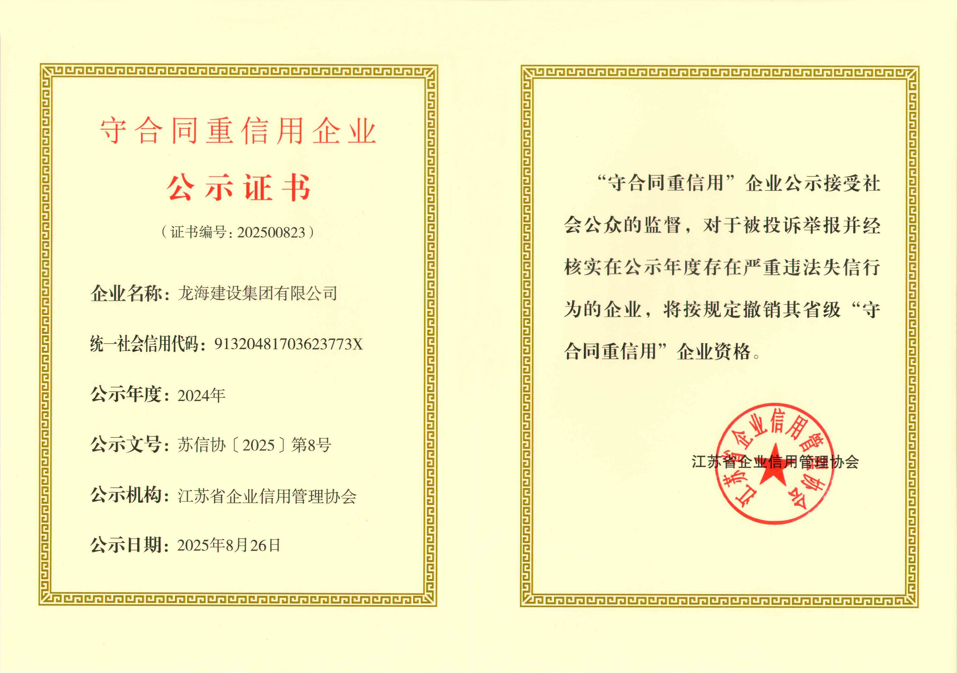 近日,從江蘇省企業(yè)信用管理協(xié)會(huì)傳來喜訊,龍海建設(shè)集團(tuán)有限公司憑借在合同管理和信用建設(shè)方面的卓越表現(xiàn),成功獲得 “2024年度江蘇省守合同重信用企業(yè)”榮譽(yù)稱號(hào)。這一榮譽(yù)不僅是對(duì)龍海建設(shè)集團(tuán)過往努力的高度認(rèn)可,更是其在建筑行業(yè)持續(xù)穩(wěn)健發(fā)展的有力見證。